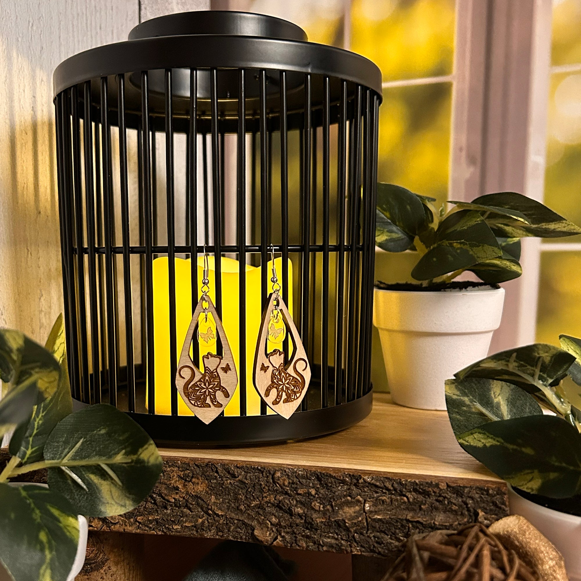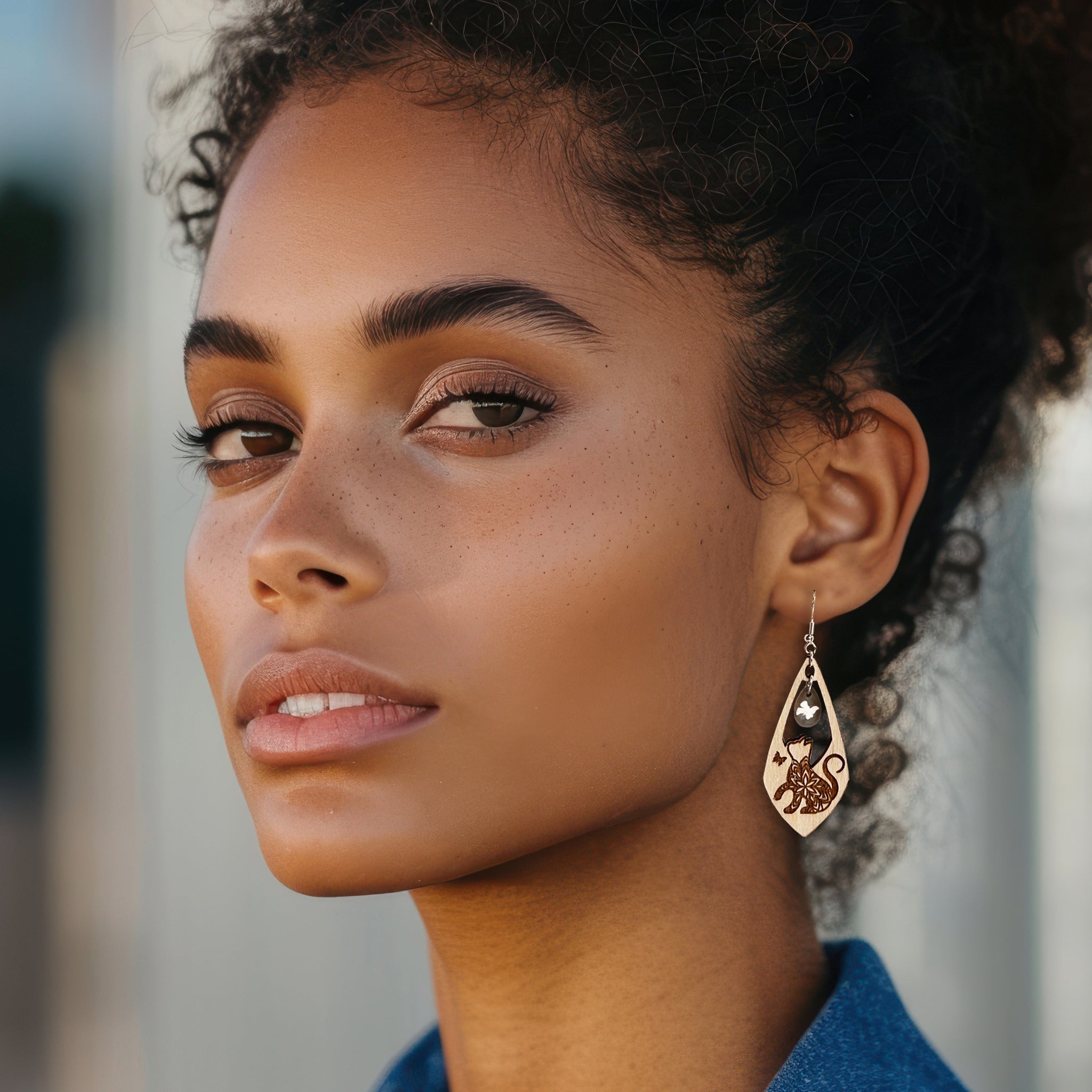 These whimsical wood mosaic cat earrings are the perfect mix of artsy, earthy, and just a little magical. Featuring an engraved cat silhouette paired with a clear acrylic butterfly accent, they’re lightweight, eye-catching, and made for pet parents who like their accessories with personality.
