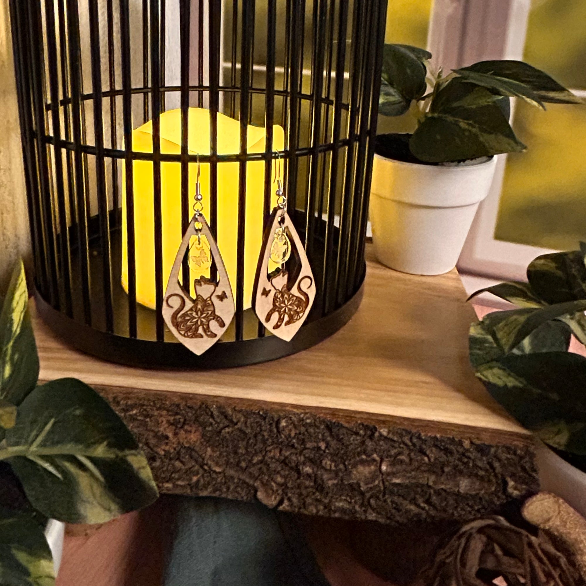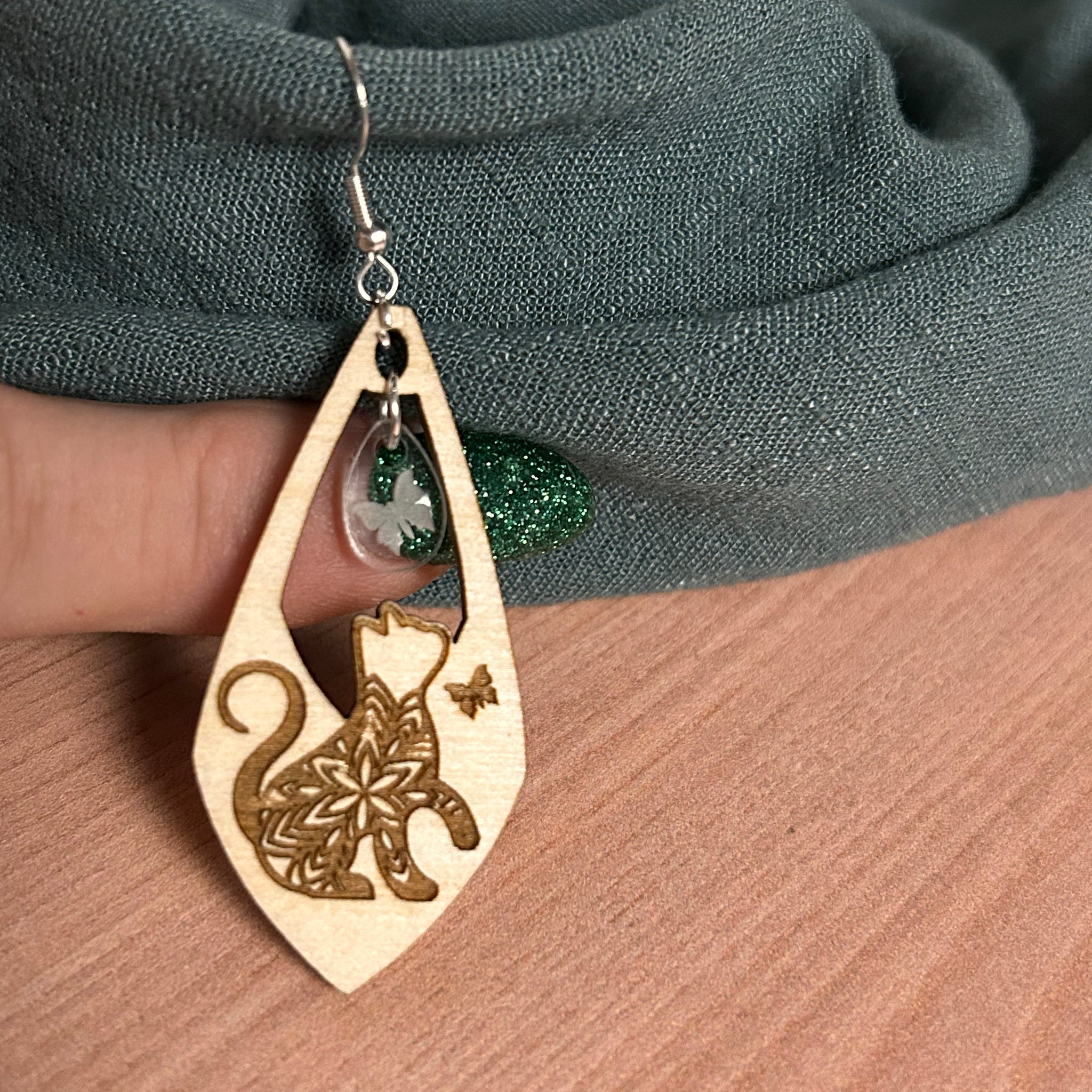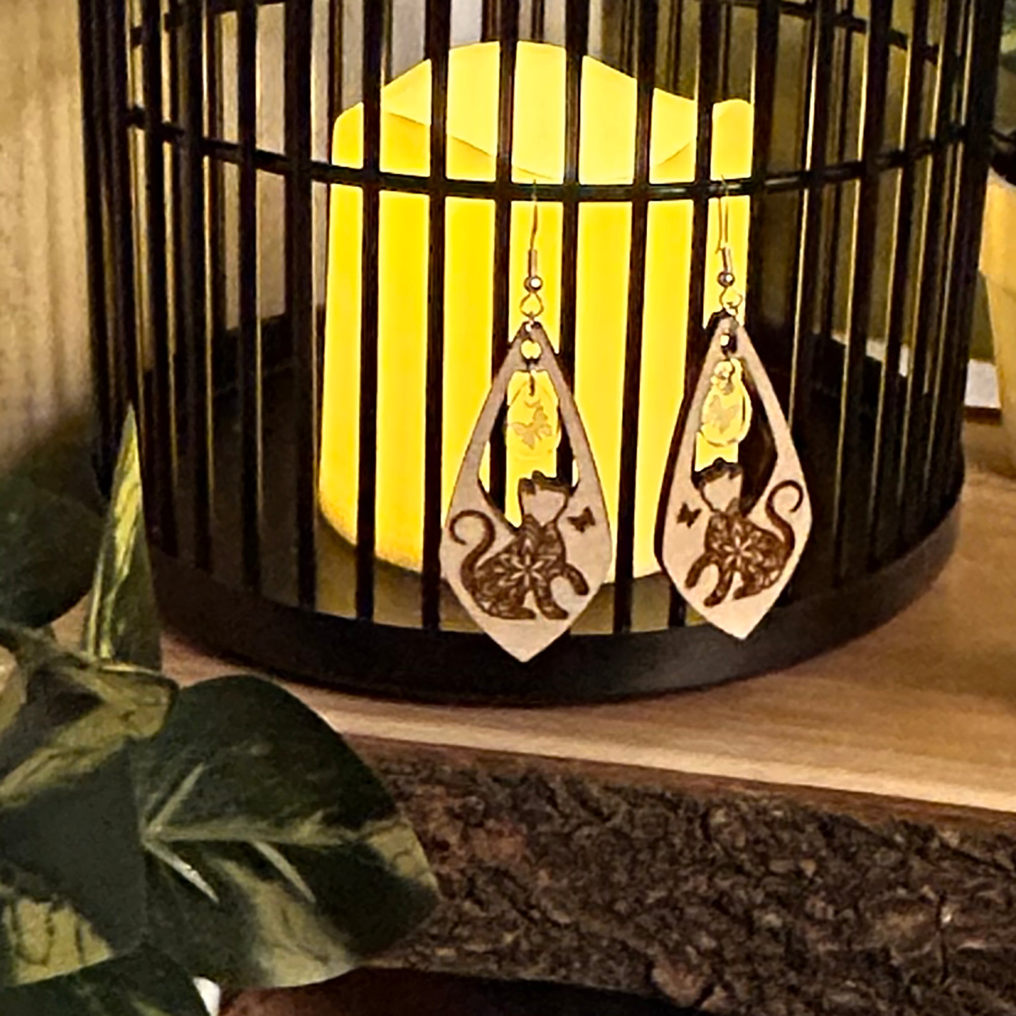 Earrings - Wood Mosaic Cat Earrings with Butterfly Charm – Sterling Silver Hooks 🐱🦋
